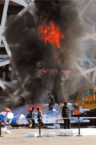 昨天中午,國家體育場西側(cè)50米處,一座正在施工中的塑料雕塑“祥云玉兔”突然起火。當(dāng)事工人稱,可能是焊接點(diǎn)濺出火花,引燃底座的泡沫材料,致使整體結(jié)構(gòu)起火。