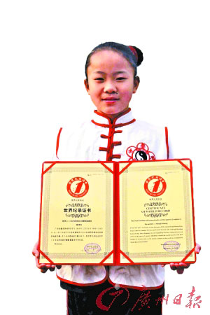 在廣東開平金雞鎮(zhèn)的一個小村莊里,一位10歲的小姑娘由于擁有一門特技而創(chuàng)造了世界紀錄。她是誰?她的特技是什么?昨日,記者帶著疑問來到她的老家,探訪了這位創(chuàng)造世界紀錄的小姑娘。