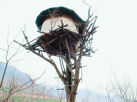這個建在樹上的房子位于眉縣湯峪鎮新聯村下轄的崗子廟村村南,遠看就像一個架在樹上的蒙古包。房子的底部是木板,正好利用樹杈自然托起,圓形墻身是用藤條箍的,外面罩了一層塑料布,屋頂上鋪的是油毛氈。村民告訴記者,在這房子中居住的杜仕升及其家人并不是為了看管果園莊稼,就是住在里面生活。