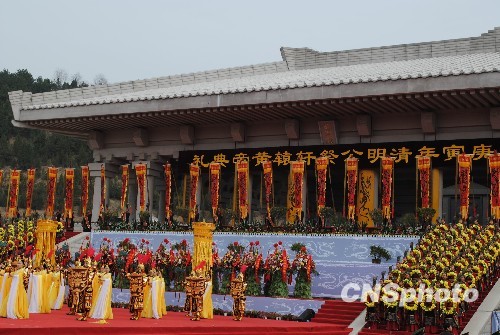 資料圖:2010年(農歷庚寅年)清明節(jié),萬余名海內外華人代表齊聚陜西黃帝陵祭祀大殿前,共同拜祭中華民族的人文始祖軒轅黃帝。圖為4月5日,樂舞告祭的場景。 中新社發(fā) 冽瑋 攝