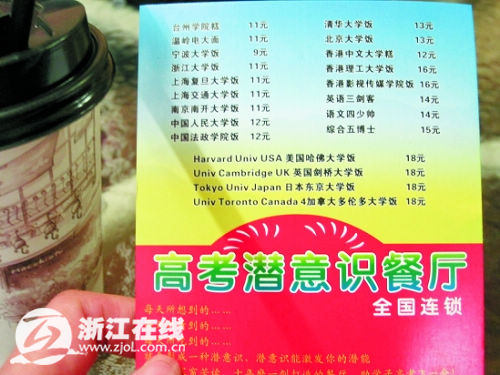 (浙江)溫嶺市日前新開出的一家“主題餐廳”,賣的不是名菜是菜名。這家餐廳所有的菜,都是以大學校名為名,炒年糕叫“臺州學院糕”,三鮮面叫“溫嶺電大面”,咖喱飯叫“清華大學飯”……