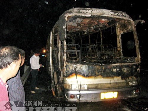當晚10時許,記者在現場看到,一輛由南寧開往武鳴的客車,燒得只剩下骨架(如圖),一輛事故清障車正在待命拖車,七八名市民站在客車旁議論紛紛。記者手持手電筒繞該輛客車走了一圈,發(fā)現客車的4個后輪只剩下鋼轱轆,發(fā)動機處還散發(fā)出刺鼻的塑料焦味。