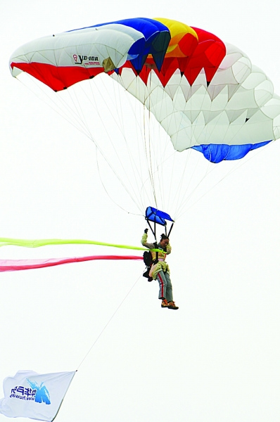夫妻身著漢服跳傘引圍觀 差點被大風吹散(圖)