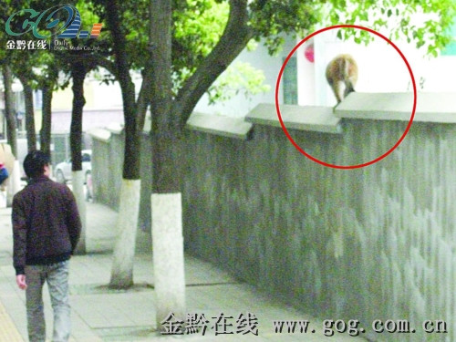 記者在現(xiàn)場見到,一只土黃色的獼猴正在醫(yī)學(xué)院附近的加油站內(nèi)游蕩,一會兒朝跳上燈桿跑去,一會兒又跳上樹梢。