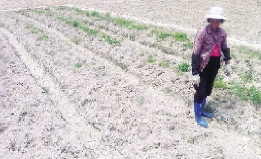 導(dǎo)報記者站在田邊,遠(yuǎn)遠(yuǎn)望去,連片的田地是青一塊黃一塊。走近了看,青的是已長成大約有30公分高的水稻苗;黃的則是干泥巴或已近枯黃的農(nóng)作物的顏色,上面還長著一些雜草。