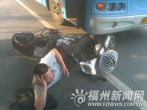 據目擊群眾介紹,這名男子騎電動車與公交車并排行駛,突然路邊竄出一輛小車,男子趕緊往旁邊讓,公交車避讓不及將男子掛倒,男子腿部被卡住,動彈不得。發(fā)現(xiàn)自己被卡住,男子并沒有慌亂,脫下身上的衣服墊在右手臂下,打電話報警后,開始玩起手機來。