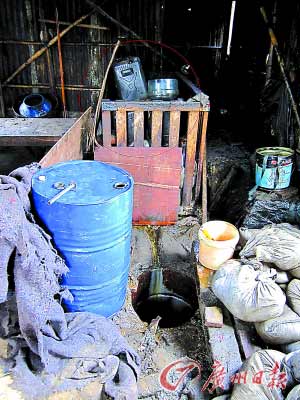 昨天下午,接到記者舉報后,塘廈鎮多部門聯合行動,將兩個地溝油黑作坊搗毀