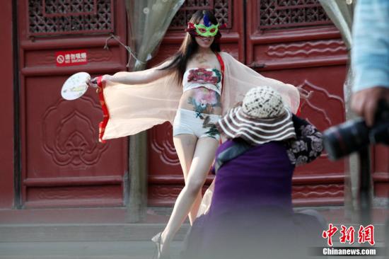 15日,山西太原文廟內上演一場人體彩繪秀。三名半裸、身繪中國傳統國畫的女模特,在孔子腳下“搔首弄姿”,展示人體藝術。