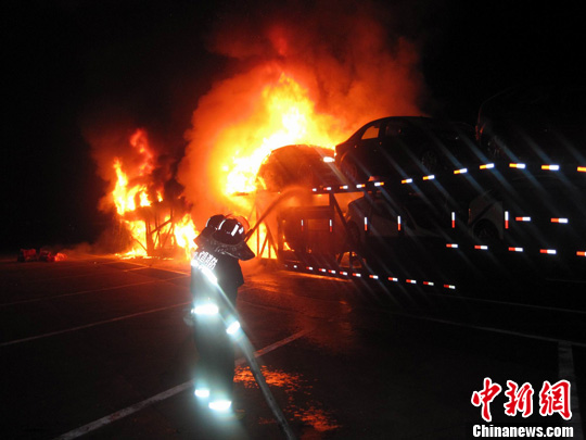 0時34分,高家堰消防執勤點兩臺消防車首先到達現場。指揮員李學根介紹,此時半掛車上2/3的汽車被熊熊的火勢包圍,火勢燃燒迅猛。隨后,消防官兵分別從兩側對火勢蔓延方向進行控制,同時組織高家堰服務區的工作人員啟動消防泵加壓給消防車供水,確;饒龉┧婚g斷,10分鐘后火勢得到有效控制。 經過參戰官兵一個小時的撲救,成功將火撲滅,在被保存的6輛商品車中除一輛部分受損外其余5輛完好無損。據悉,失火的半掛車從重慶出發準備運往青島。火災原因有待進一步調查。(王申)