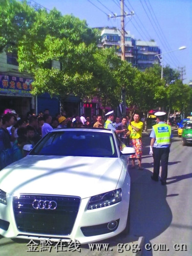 據(jù)了解,昨日下午3點(diǎn)半左右,在貴陽(yáng)興關(guān)路轉(zhuǎn)盤(pán)處,貴陽(yáng)交警二大隊(duì)二中隊(duì)民警攔下一輛從軍區(qū)方向開(kāi)來(lái)的白色奧迪轎車(chē),該車(chē)未懸掛機(jī)動(dòng)車(chē)號(hào)牌。交警對(duì)車(chē)主進(jìn)行詢問(wèn),該車(chē)車(chē)主拿出一張臨時(shí)號(hào)牌,但號(hào)牌已經(jīng)過(guò)期。當(dāng)交警讓該車(chē)車(chē)主出示駕駛證等有關(guān)證件時(shí),沒(méi)想到該車(chē)車(chē)主看見(jiàn)路口綠燈亮了,馬上發(fā)動(dòng)車(chē)子往前駛?cè)ァ?