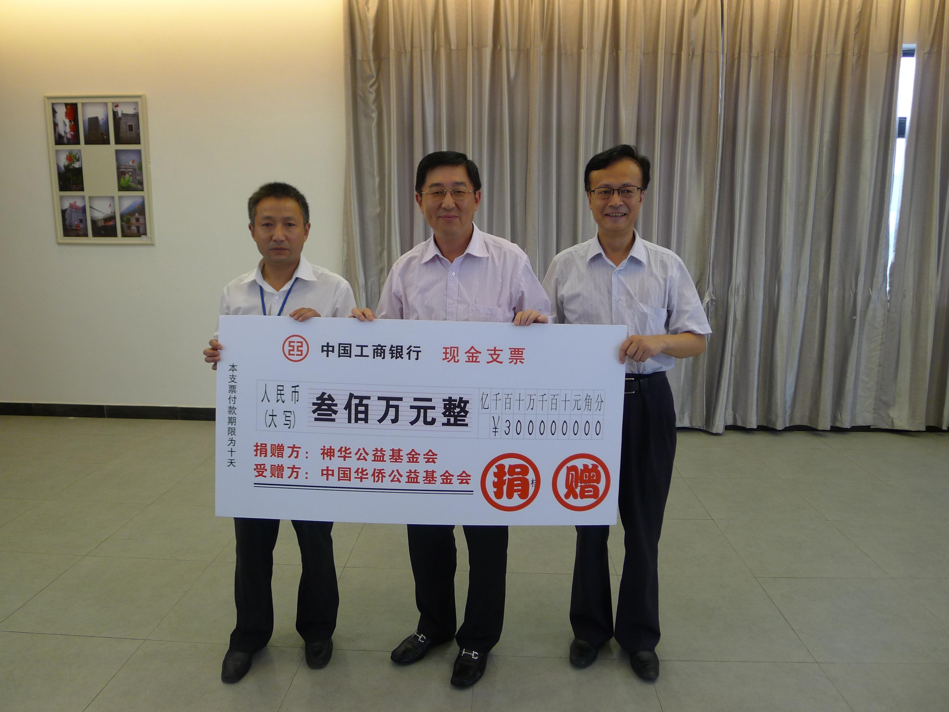中國僑聯主席、中國華僑公益基金會理事長喬衛(中),神華集團總經理助理、財務部總經理、神華公益基金會副理事長兼秘書長翟日成(右)向北川中學校長劉亞春捐贈支票。