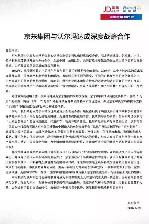 據此協議內容,沃爾瑪將獲得京東新發行的144,952,250股A類普通股,約為京東發行總股本數的5%。京東將擁有1號商城主要資產,包括“1號店”的品牌、網站、APP。沃爾瑪將繼續經營1號店自營業務,并入駐1號商城。“山姆會員商店”將在京東平臺上開設官方旗艦店,同時,京東將獲得“垂涎已久”的超市資源。