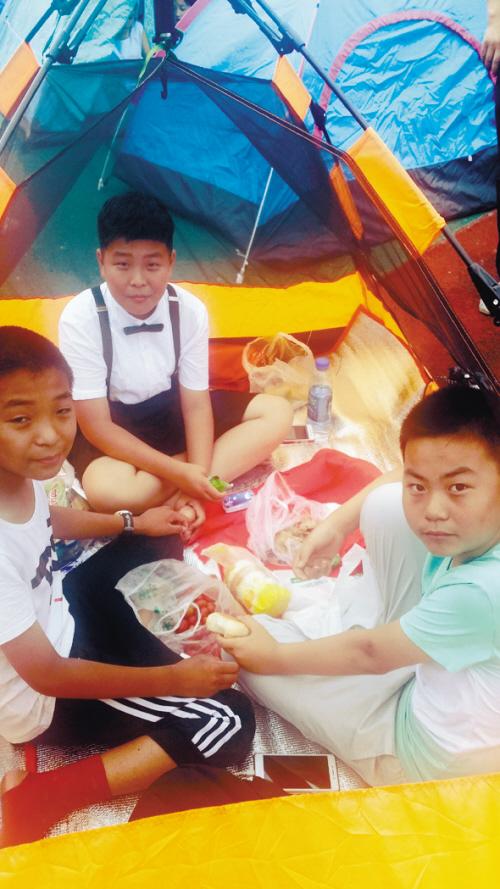 7月23日18時,記者在現(xiàn)場看到,在簡短的畢業(yè)典禮結(jié)束后,畢業(yè)露營活動拉開了序幕。近100頂帳篷在操場上搭就,三三兩兩的孩子自由組合進入帳篷,分享他們自己準備的美餐。