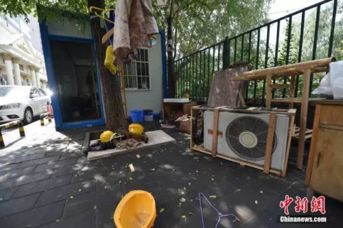 工人剛搬進(jìn)帶空調(diào)的“新家”又變了,“柜子”被要求馬上拆除。圖為“柜子”旁堆放的雜物和拆下來的空調(diào)。 金碩 攝