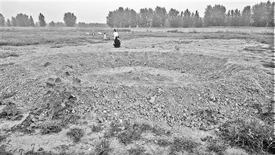 在周口港口物流產業集聚區(簡稱“周口港區”)一條新修的名為“巴鐵大道”的公路一側,被白色圍墻圈起的數百畝土地荒草叢生,草叢內零星散落著石塊,有人趕著羊群在圍墻內吃草。在沒有荒草的中間區域,赫然出現一個新挖的直徑約十米的大坑,幾個孩童在爬上爬下。