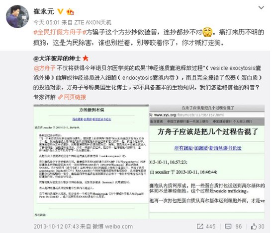 微博原文:#全民打假方舟子#方騙子這個方抄抄做磕普,連抄都抄不對。痛打來歷不明的瘋狗,這是為民除害,誰也別攔著。別等咬著你了,你才喊打走狗。