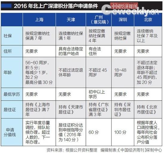 隨著北京《管理辦法》的出臺,至此,北京、上海、廣州、深圳、天津等市區常住人口超千萬的超大城市,均已提出或實施各自的積分落戶指標體系(見右上圖)。