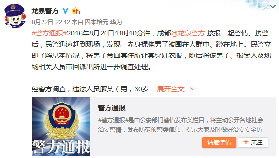 通報稱,2016年8月20日11時10分許,成都龍泉警方接報一起警情。接警后,民警迅速趕到現(xiàn)場,發(fā)現(xiàn)一赤身裸體男子被圍在人群中、蹲在地上。民警立即了解基本情況,將男子帶回其住所讓其穿好衣服,隨后將該男子、報案人及現(xiàn)場相關(guān)人員帶回派出所進(jìn)一步調(diào)查處理。