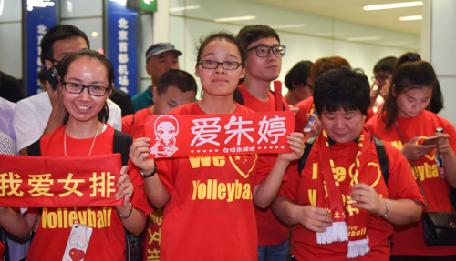 央視網消息:23日晚約十點,載譽歸來的中國女排抵達北京首都國際機場,現場接機球迷在見到女排隊伍后陷入沸騰。原定北京時間晚上七點四十落地的中國女排,因飛機晚點約兩個小時,在晚上十點左右才抵達機場。此后,經過約一個小時的等待,現場球迷和媒體終于見到了女排姑娘們的面容。當主教練郎平及其弟子朱婷、惠若琪等人出現在機場到達通道時,粉絲們大聲喊起口號、高舉橫幅、海報、鮮花,歡迎女排勝利歸來。