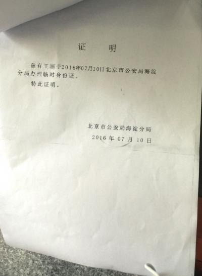 臨時(shí)身份證有效期超過90天。證明中未填寫辦理人的身份證號(hào)。當(dāng)事人供圖