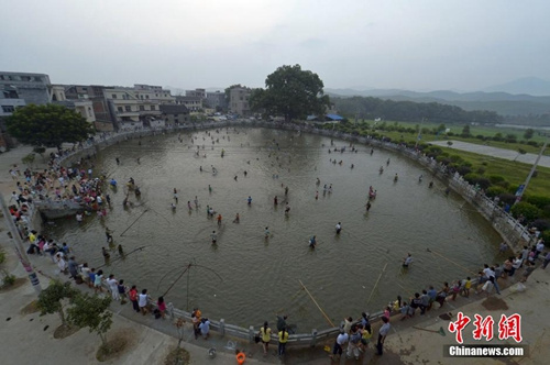 資料圖:歡度中秋佳節(jié) 湖南江永上演捕魚“大戰(zhàn)”。中新社發(fā) 黃海 攝
