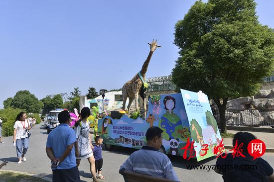 最后篇章的動(dòng)物科普篇——?jiǎng)游镏畾懀蛴慰团笥褌冋故镜氖莿?dòng)物標(biāo)本。其中最為特別的是身高3米多的長頸鹿標(biāo)本。遠(yuǎn)遠(yuǎn)看去,一只高大的長頸鹿穩(wěn)穩(wěn)地站在花車上,不知情況的游客們都好奇,“怎么一動(dòng)不動(dòng)呢?”原來,前幾年,這只長頸鹿誤食了游客亂投喂的食物特別是塑料袋而導(dǎo)致了死亡。無錫動(dòng)物園也非常不舍得丟棄它的尸體,便將其尸體制成了標(biāo)本保存。這次參與巡游,也是動(dòng)物們現(xiàn)身說法“愛我請(qǐng)不要投喂我,我們有自己的食物”、“我們都是食品塑料袋的受害者”、“保護(hù)地球、愛護(hù)環(huán)境”……壓軸的黑猩猩河童與飼養(yǎng)員一起騎著自行車,也在呼吁游客朋友們愛護(hù)動(dòng)物。五大方陣中,還有可愛的卡通人偶、搞怪的小丑與小朋友現(xiàn)場互動(dòng)哦。