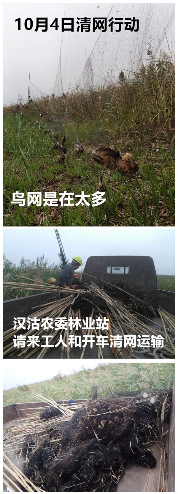 此前,9月29日下午,天津護鳥志愿者在天津濱海新區漢沽楊家泊鎮高莊鎮與唐山市交界區2平方公里區域發現大面積鳥網,天津護鳥志愿者聯盟、天津漢沽護鳥隊、“讓候鳥飛”公益基金出動30人次,清理到10月1日,清除了近萬米鳥網,總共解救活鳥將近1000只,在網上的死鳥2000多只。