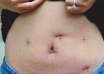 至此,鄭女士一共經歷了三次手術。掀開上衣,鄭女士指著肚上多處縫合傷口說:“本來只有3個小孔,現在變成了6個洞,而且有3處打開、縫合了3次。”