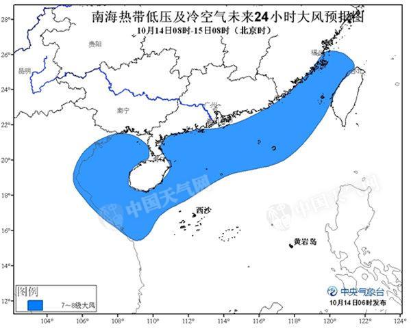 大風預報:14日08時至15日08時,受冷空氣和南海低壓殘余系統共同影響,臺灣海峽、南海北部、南海中北部偏西海域、北部灣、瓊州海峽、海南沿海、廣西部分沿海、廣東沿海、福建沿海有7~8級大風,部分海域和地區陣風9~10級。