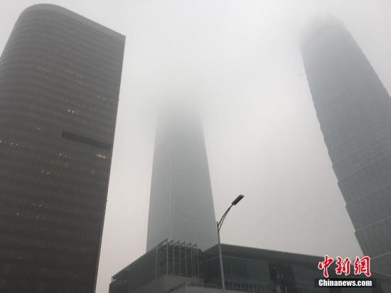 10月19日消息,昨天16時,北京市氣象臺發布霾黃色預警信號,預計昨日傍晚至19日北京大部地區有中度霾,南部地區有重度霾。圖為國貿附近被霧霾籠罩,能見度降低。富田 攝