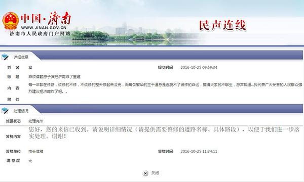 這本是市民抱怨之辭,沒想到濟南市政府網站竟然回復了。內容如下: