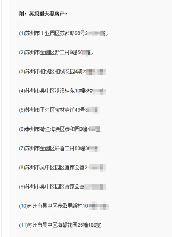 澎湃新聞記者查詢發(fā)現(xiàn),網(wǎng)帖中所列舉的吳旭麒夫妻名下的11處房產(chǎn)中,第一處即“蘇州市工業(yè)園區(qū)蘇茜路98號2-1001室”,與第八處即“蘇州市吳中區(qū)園區(qū)宜家公寓2-1001室”,系同一處房產(chǎn)。也就是說,網(wǎng)帖爆料提及的房產(chǎn)實際上共有10處。澎湃新聞記者向蘇州市工業(yè)園區(qū)房產(chǎn)交易中心了解到,該公寓“曾由吳旭麒夫妻共同持有,2016年初過戶到他人名下”。