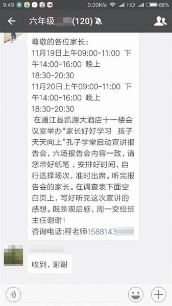 記者聯系上負責講座咨詢的程老師,他表示,此次活動并沒有和通江縣教育科技體育局聯系,在和通江縣實驗小學對接時,確實講過要向學校捐贈孔子文化教室,但目前還未定。在酒店舉行講座的事情沒有向通江縣實驗小學提過。他們在學校門口組織志愿者發調查表,在通江的其他學校門口也發了調查表。對于老師在群里向家長發講座信息,程老師表示是個人行為,義務幫忙。程認為,講座不收錢就是公益講座,推銷產品家長購買是家長的自愿行為。