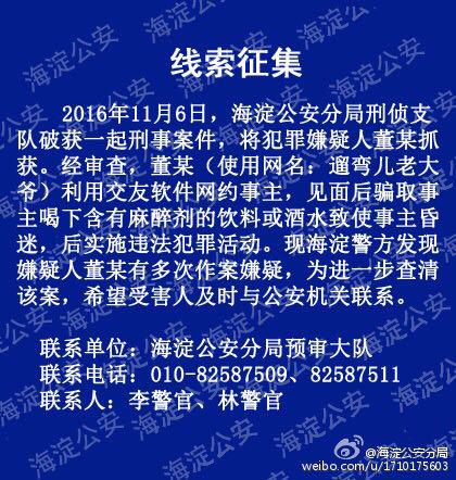 目前海淀警方發現嫌疑人董某有多次作案嫌疑,為進一步查清該案,希望受害人及時與公安機關聯系。