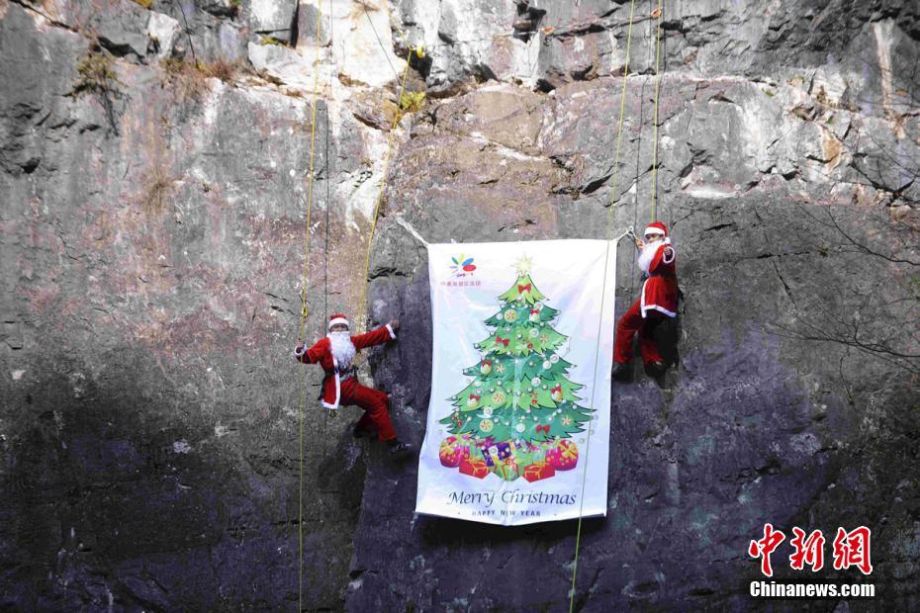 12月22日,正值圣誕節(jié)前夕,湖南湄江三道巖門(mén)的工作人員裝扮成圣誕老人爬上百米懸崖,在崖壁邊放上了禮品盒,并掛起了巨幅圣誕樹(shù)海報(bào),以此迎接即將到來(lái)的圣誕節(jié)。 楊華峰 攝