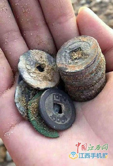 近日,江西新干縣三湖鎮(zhèn)曾坊村旁的贛江沙灘上,挖出大量古錢幣和寶劍,引發(fā)村民哄搶。這些錢幣大小各異,大部分都已泛起銅綠,有的還與黃泥牢牢地粘在一起,看上去年代已非常久遠(yuǎn)。經(jīng)過水洗之后,可以發(fā)現(xiàn)上面寫有“乾隆通寶”等字樣。