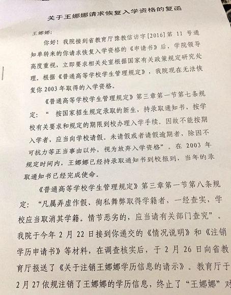 9月14日,王娜娜向周口職業技術學院郵寄《學籍恢復申請》。10月18日,周口市職業技術學院出具回函稱:“在2003年規定時間內,王娜娜已經持錄取通知書到校報到,當年錄取通知書已經完成使命……你被冒名頂替上學的事實已公之于眾,相關責任人已有相關部門處理……找不到恢復你入學資格的法律、法規和政策依據,無權恢復你的學籍。”