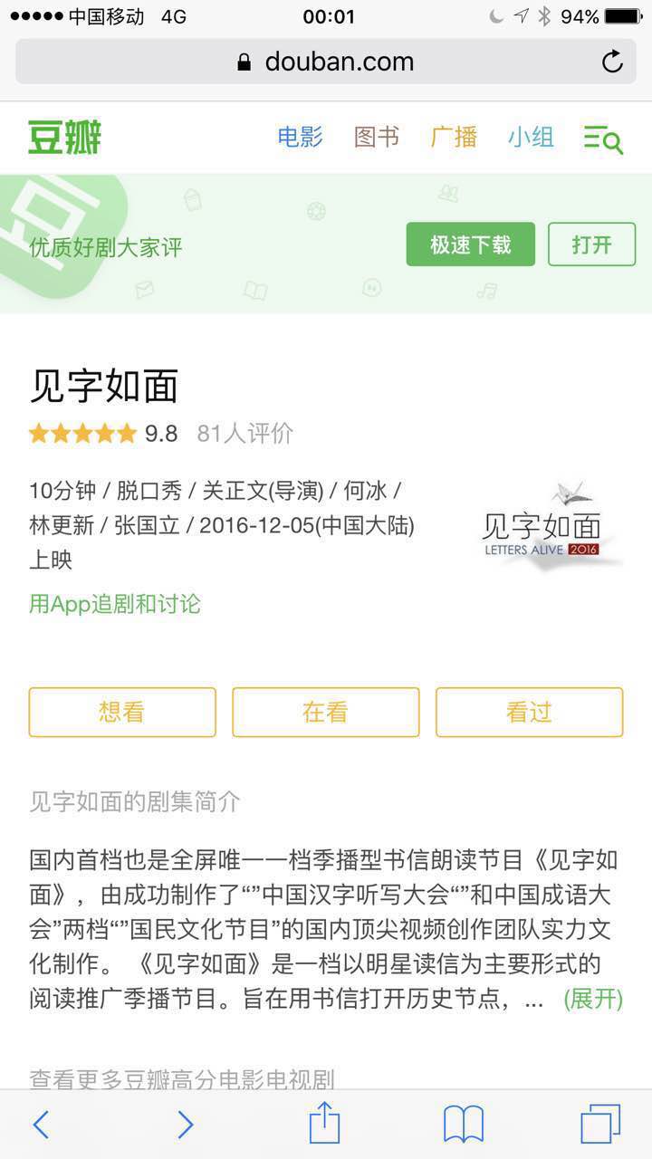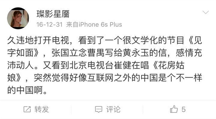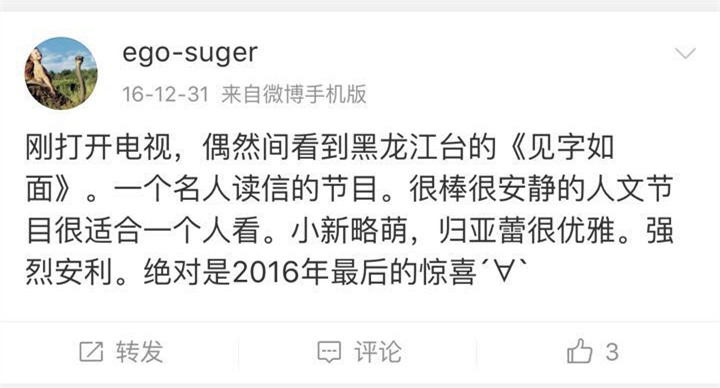 “有質(zhì)感”,“有內(nèi)涵”,“錘擊內(nèi)心”,“第一次看到這樣新穎的節(jié)目”,“絕對是2016年最后的驚喜”,“今年最值得傳播的節(jié)目”,“在2016年最好的、最有意義的一檔節(jié)目”……網(wǎng)友如此評價《見字如面》,并稱這是一檔能夠給人帶來靜謐的節(jié)目,“可以讓人思考、自修“,并讓人“突然覺得好像互聯(lián)網(wǎng)之外的中國是個不一樣的中國啊”。