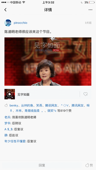 在《見字如面》熱播熱議的同時,推薦自己心目最適合這檔節(jié)目的藝人來當(dāng)讀信人,成為網(wǎng)友們看完《見字如面》后又一個不約而同的群體性行為。目前陳道明、王凱、靳東、胡歌、祖峰等演員的呼聲最高。僅在騰訊視頻的一個評論下,已有819個人自動蓋樓呼吁陳道明前來讀信;還有很多網(wǎng)友點(diǎn)名胡歌朗讀《與妻書》……