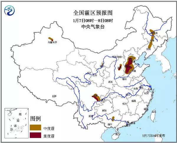今天,霾范圍繼續縮減,但華北等地依然被霾籠罩。預計7日08時至8日08時,北京中南部、天津中西部、河北中南部、河南北部、山東西北部、山西中部、四川盆地西部等地有中度霾,其中,北京南部、河北中南部、河南北部、山西中部、四川盆地西南部等地的部分地區有重度霾。為此,中央氣象臺今天早上6時發布霾黃色預警。