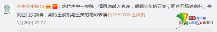 對于整場春晚來講,也有網友發表了自己的看法。網友“桃瑞熊”表示:開場雖然不是TF粉,但是很養眼;蜘蛛人、我驕傲有點吵有點亢奮;好賤嘻哈根本沒印象;蔡明還挺逗,想死你們了也還行;滑稽戲恕我北方人不懂。鮮肉總體陽光清新,瑯琊唱功不凡,顏值很高。三軍儀仗隊航天英雄值得敬佩。成龍大哥是一晚上最讓人感動的,永遠的大哥!難忘今宵還沒聽,但經典?傮w70分。
