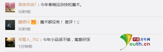 不過也有網友覺得美中不足,今年節目中缺少了雜技和魔術。這或許就成為下一年春晚的進步空間了呢。