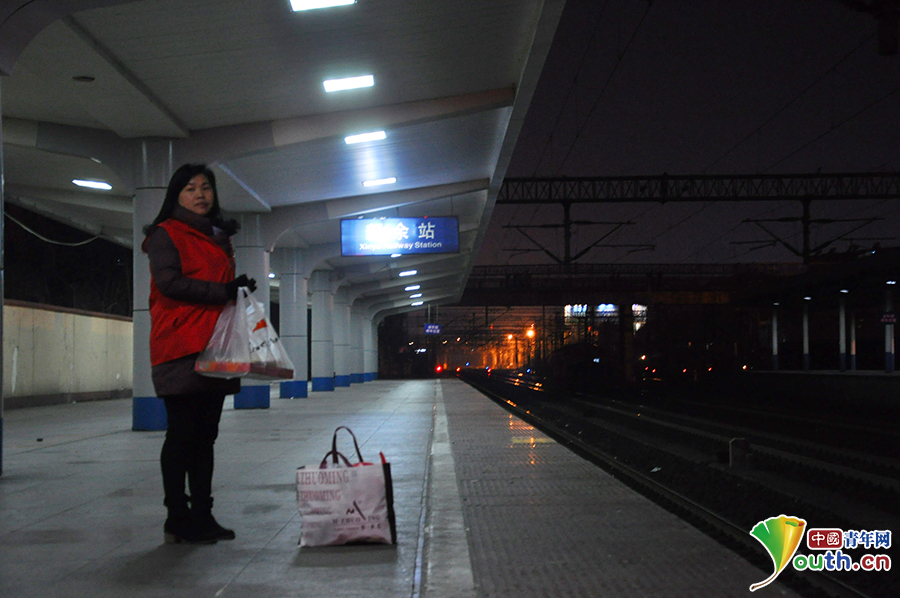 在站臺上等待著列車的程媽媽。中國青年網 袁誠 潘哲 攝