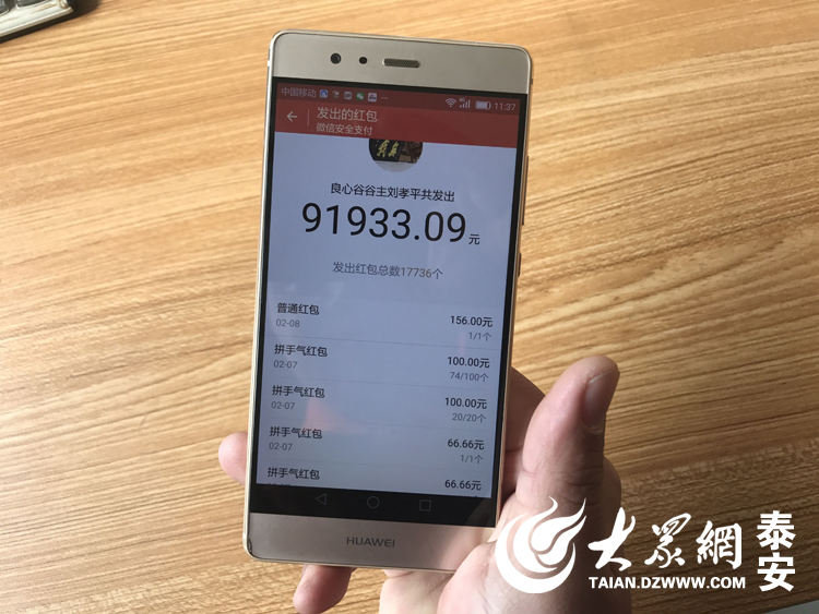 大眾網泰安2月9日訊(記者 付瑩)過年期間,微信紅包已成為國人“新寵”,春節將近尾聲,你收發了多少個微信紅包?在山東泰安,就有這么一位網名“良心谷谷主劉孝平”的“紅包哥”,短短一個月就在陌生網友群里發出了17736個紅包,共發出91933.09元。金額最多時,一天就發了近4萬元。”一位偶然進入”良心谷“紅包群的網友告訴記者,春節短短七天,最多的一天就搶了“谷主”800元紅包,“我摸清了他發紅包的規律,每天等著,為了搶紅包,大年三十都沒顧得上和爸媽好好說話。”還有一位網友在打開支付寶的積“福”開獎后,看到中獎金額,感嘆“谷主比馬云對我們好”。