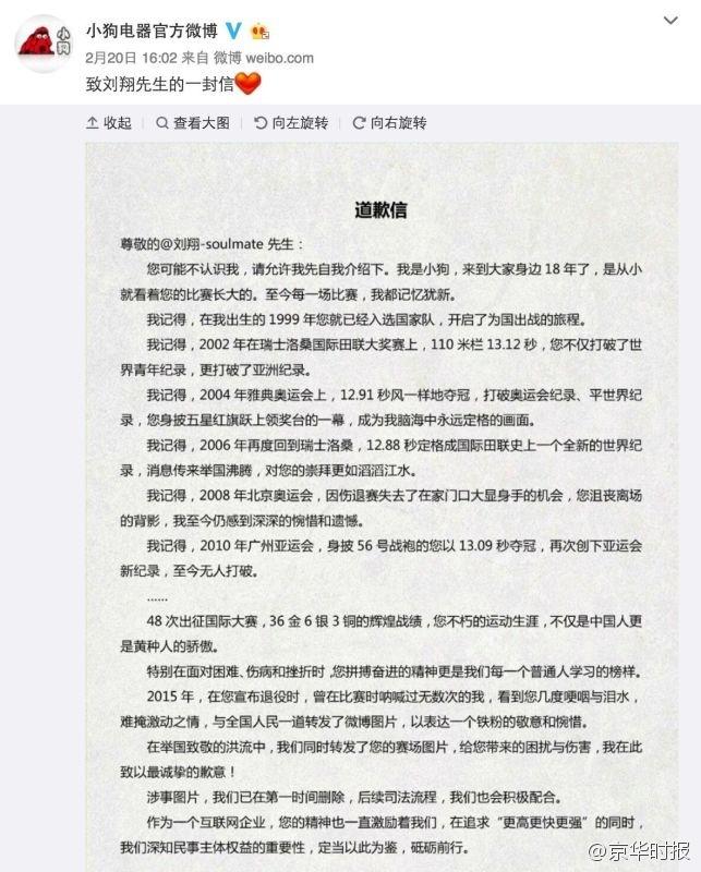 【劉翔維權事件再起!】#劉翔起訴小狗# 劉翔維權風波再起,日前,小狗電器因曾向前國家運動員,奧運冠軍劉翔退役致敬,未經劉翔同意使用其照片發布于@小狗電器官方微博 上,受到劉翔起訴,要求索賠人民幣近60萬元。新媒體營銷大行其道的當下,肖像權、版權等諸多問題逐漸浮現。如何合理合適的運用致敬方式,是企業新媒體運營應當思考的。