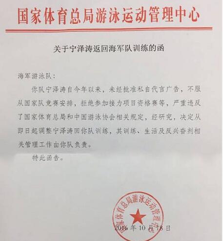 從曝光的文件內(nèi)容看,文件是游泳中心發(fā)給海軍游泳隊的公涵,“決定從即日起調(diào)整寧澤濤回你隊訓(xùn)練,其訓(xùn)練、生活及反興奮劑相關(guān)管理工作由你隊負(fù)責(zé)。”至于理由,文件稱寧澤濤嚴(yán)重違反了國家體育總局和中國游泳協(xié)會的相關(guān)規(guī)定,“你隊寧澤濤自今年以來,未經(jīng)批準(zhǔn)私自代言廣告,不服從國家隊競賽安排,拒絕參加接力項目資格賽等。”(法制晚報微信公號ID:fzwb_52165216)