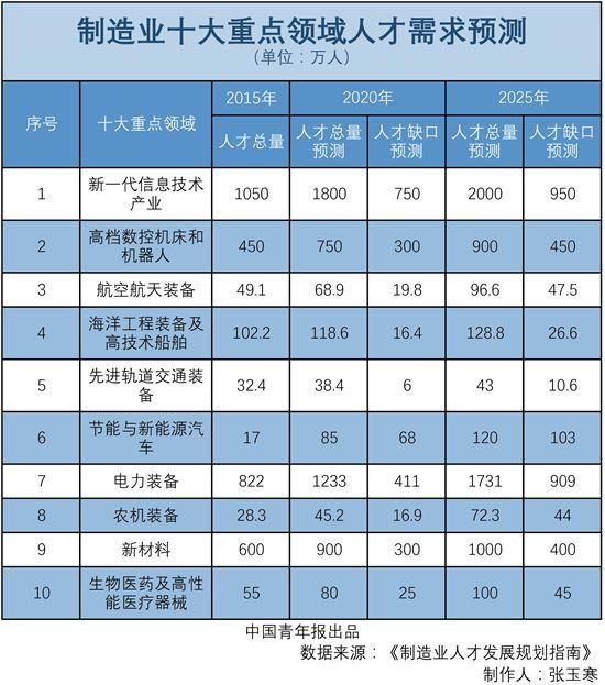 在《指南》中,最引人注目的要數其列出的“制造業十大重點領域人才需求預測”。在這份預測中,新一代信息技術產業、高檔數控機床和機器人、航空航天裝備、海洋工程裝備及高技術船舶、先進軌道交通裝備、節能與新能源汽車、電力裝備、農機裝備、新材料、生物醫藥及高性能醫療器械等10個專業榜上有名。