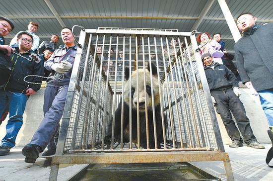 上午9時(shí)許,飼養(yǎng)員趁著“蜀蘭”早膳的時(shí)間對(duì)她進(jìn)行出行前的身體檢查。體重95.6公斤,體溫36.2度,血壓正常。