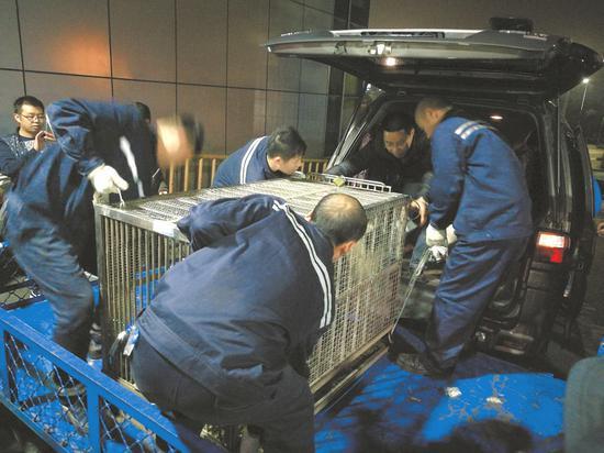 經(jīng)過(guò)近一個(gè)半小時(shí)的空中旅行,剛下飛機(jī)的“蜀蘭”還有一點(diǎn)驚慌。面對(duì)機(jī)場(chǎng)運(yùn)輸工作人員,她有些焦慮地在籠子里轉(zhuǎn)來(lái)轉(zhuǎn)去,變換姿勢(shì)。