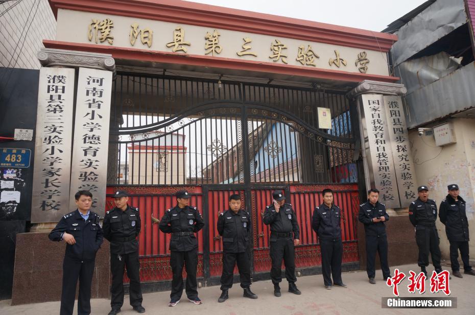 3月22日,河南濮陽縣第三實驗小學老校區發生學生踩踏事故,官方通報稱,截至15時,事故共造成22名學生受傷,其中一人送醫途中死亡,5人重傷,傷者正在醫院救治。記者當天下午三點到達事發學校,了解到事故原因是:該校當天舉行全校月考,學生在早上8點半考試前大量集中上廁所,在從二樓下到一樓時有學生跌倒,發生踩踏。圖為事故發生后學校已經停課,武警在校門口戒嚴。 韓章云 攝